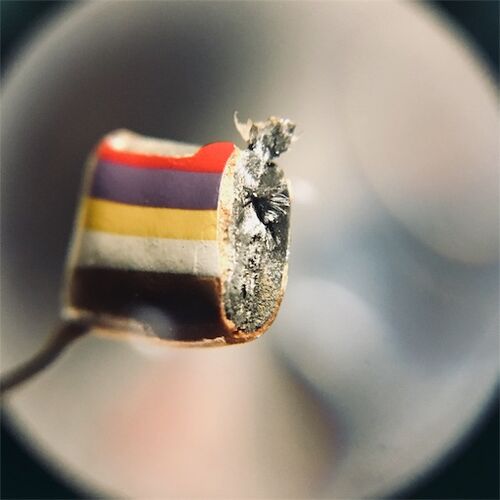 先日仕入れたコンデンサであるが、使用に耐えない物が多く出た。 かと言って、単に捨てる訳でもなく、研究材料として分析してみた。 リードが取れてしまったトロピカルフィッシュ。 なるべくホイルを負傷させない様にとやったが、端が切れてしまう。 外側は2…