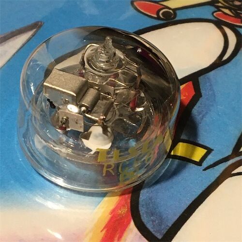袴の無いキノコを仕入れた。 ベタ置きではピンも内側に収納されているからガラスが直に面に接する。 電極はその構造上、横向きである。 裏返し。 傍熱3極管だから脚は5本。 キノコというよりは、ベレー帽だったな こりゃ(^ω^;;) そういやデフォ子はベレー帽…