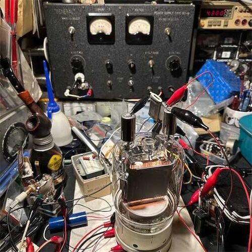 ハムと機械的ノイズが酷いからどうにかしてほしい。という改良依頼。 使用球を見ると直熱管で、ハムもマイクロホニックも致し方ないかなという印象。 ナスのデザインで、この時代の物ともなれば、AF用途ではなく、RF、高周波用途である可能性は非常に高く、A…